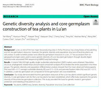 近日,BB贝博刘东教授团队在国际知名期刊《BMC Plant Biology》(中科院2区TOP,IF=4.3)发表题为“Genetic diversity analysis and core germplasm construction of tea plants in Lu’an”的研究论文。BB贝博艾弗森官方网站BB贝博艾弗森官方网站为论文第一单位及通讯作者单...