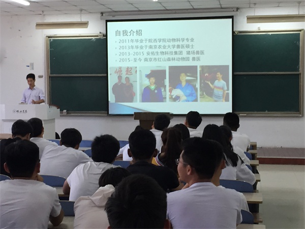 6月7日下午,动物科学专业邀请2011届优秀校友、南京市红山森林动物园管理处兽医师程王琨,为本专业2016级同学做了题为“动物园的职能以及动物园兽医的日常工作”的专题讲座。程王琨分别从动物园的“保护教育、物种保护、科学研究、娱乐休闲”等四大职能以及“...
