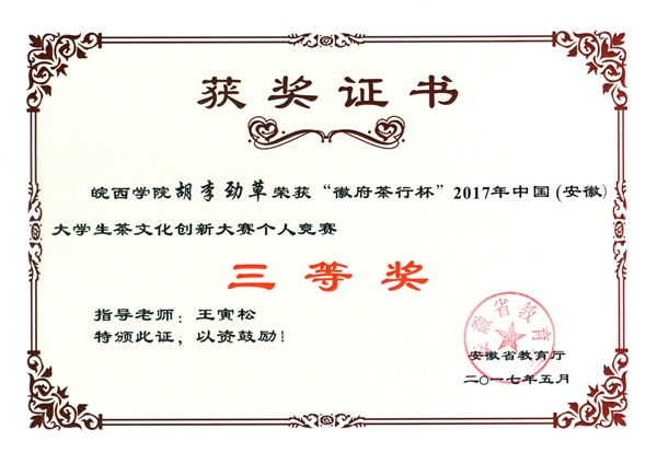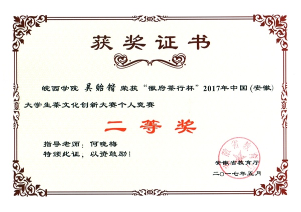 中国是茶的故乡,茶伴随着古老的中国走过了漫长的岁月,中华五千年的浩繁卷帙每一页都浸染着茶叶的沁香。茶不仅是一种饮品,更是博大精深的文化。BB贝博参加“徽府茶行杯”2017年中国(安徽)大学生茶文化创新大赛,不仅让我院学生得到了历练,更是对茶文化的一种传承,使茶文化深入当代大学生的灵魂深处。(图、文/何晓梅 审核/余学玉)