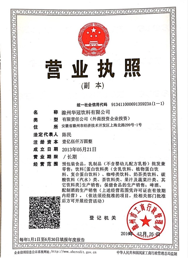 201611月,滁州华冠饮料有限公司投资建设了“24000/时新型包装精酿啤酒的研发、生产项目”。