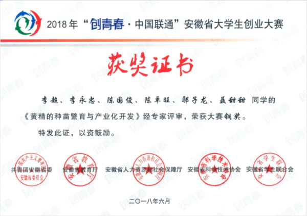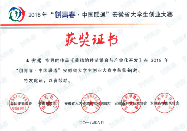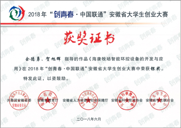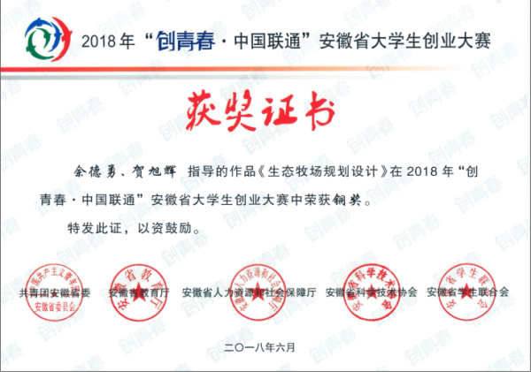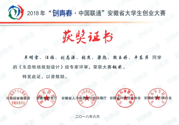 2018年6月2日,由共青团安徽省委、省教育厅、省人力资源和社会保障厅、省科协、省学联等单位共同主办,安徽财经大学承办,中国联通安徽省分公司协办的2018“创青春·中国联通”安徽省大学生创业大赛终审决赛在安徽财经大学拉开帷幕。我院由佘德勇、贺旭辉两位老师指导的动物科学专业童刚同学团队的参赛项目《海康牧场智能环控设备的开发与应用》和卓明雪同学团队的参赛项目《生态牧场规划设计》分别获得银奖和铜奖、王寅嵩老师指导的药物制剂专业李超同学团队的参赛项目《黄精的种苗繁育与产业化开发》获得铜奖。