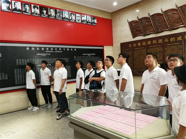 红军广场中央矗立着由刘伯承亲笔题词“燎原星火”的革命烈士纪念塔,彰显着生生不息的红色革命精神。队员们在院团总支兼职副书记熊延椿的带领下来到了金寨县红军纪念堂和金寨县革命博物馆,瞻仰着一件件红军革命历史文物及图片,队员们仿佛置身于那个烽火燎原的革命年代,仿佛看到了当年的红军将士们的意气风发和勇敢无畏。最后,志愿服务队参观了洪学智将军纪念馆,“风云叱咤八十载,英名浩气永相传”是对两膺上将洪学智最好的评价。纪念馆以丰富的实物、照片和资料,展示了洪学智将军一生光辉传奇的革命经历和他为人民解放事业和军队建设所建立的丰功伟绩。参观完纪念馆之后,队员们前往烈士陵园缅怀先烈。