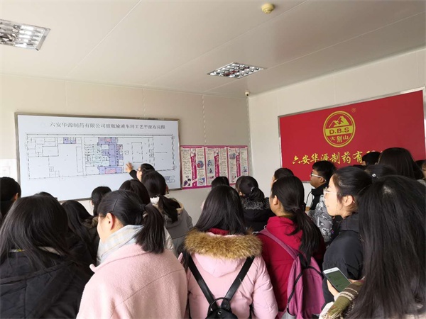 六安华源制药有限公司是六安市唯一一家集原料药、制剂为一体的综合性化学制药企业。分管生产副总陆星首先在会议室对企业历史、文化、GMP规范、厂区规划等进行了详细的介绍。随后在各车间主任的带领下,同学们分批参观了玻瓶车间、塑瓶车间、制水车间、空调净化系统、厂区情况等。在参观工程中对车间的分布、生产流程原理、和线上操作进行了详细讲解。
