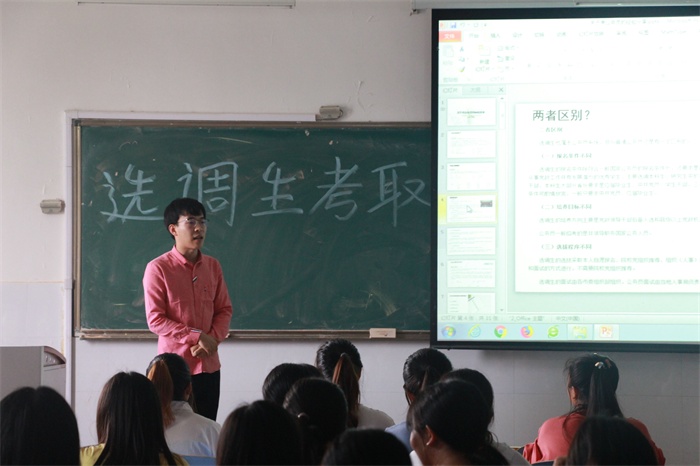 首先,由熊延椿对两位优秀毕业生代表和出席本次分享会所有成员表示热烈欢迎。随后潘蒙分享关于公务员以及选调生的考取经验,她首先说明什么是选调生以及选调生所从事的岗位、考取条件。并表示想要考取选调生必须是党员、预备党员,她强调了选调生的报考流程和考试方式,并且向同学们展示了选调生的部分考试题目以及分析方法,让同学们对选调生的考试有一定的了解,她告诉同学们答题的核心是分析和解答,还向同学们介绍了一些考试软件,并告诉同学考取选调生可能会有的两大瓶颈期,所以想要考取选调生必须有破釜沉舟的决心。最后刘伟向同学们介绍考取选调生的过程,特别强调了考试过程中的面试,他认为面试尤为重要,最后分析了近年研究生、公务员和选调生的就业前景,最后祝愿所有学生都能考出自己理想的成绩。