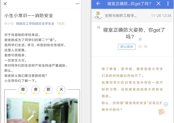 学院团总支学生会官方微信公众号和易班平台进行消防法律法规及消防安全知识宣传,让学生了解消防安全的相关知识,进一步认识火灾的巨大危害,增强学生遵守宿舍管理制度的自觉性,不使用违规电器和明火,维护公共安全。