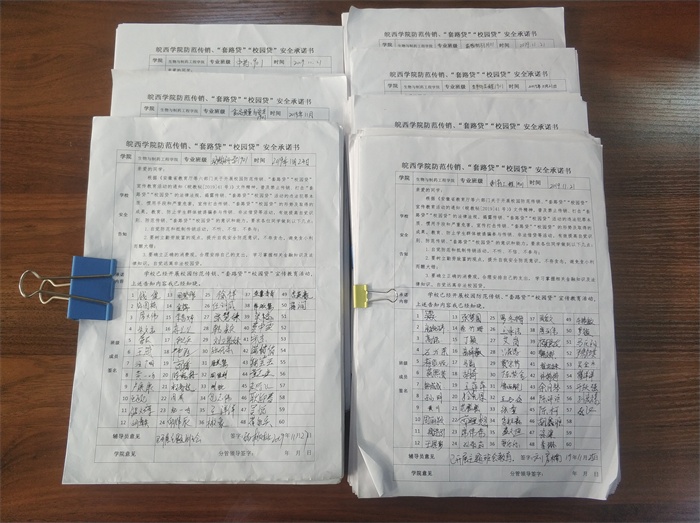 进行签署安全承诺书。大一各班级学生签署安全承诺书,通过承诺书活动,向大一新生强调传销、“套路贷”“校园贷”活动的违法犯罪本质、惯用手段和严重危害,并要求大家自觉防范和抵制传销、“套路贷”“校园贷”,做到不听、不信、不参与。