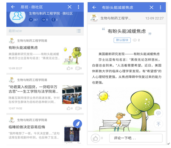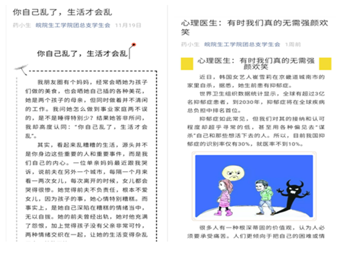 每月在生工学院团总支学生会官微和易班平台推送心理健康小知识、短视频等普及心理健康知识,更多学生学会如何合理安排合理安排时间、进行自我疗愈和情绪管理。