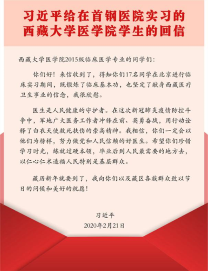 为了促进此次线上活动的正常开展,BB贝博艾弗森官方网站团总支通过QQ公众号、各班班群等线上网络平台广泛的进行宣传,向团员青年展示了《习近平总书记给在首钢医院实习的西藏大学医学院学生的回信》这一重要文件,使大家充分了解奋战在疫情第一线的白衣天使的不懈努力以及习近平总书记对广大青年学子的殷切期望。在此次线上团日活动中,各班辅导员和团支部书记在线组织团员深入学习回信内容并加以思考,通过线上交流的形式展开讨论、抒发个人感想。
