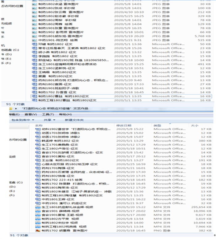 大一至大三各班级同学踊跃参与 “打造阳光心态·积极应对疫情”文艺作品征集活动,共收集了91个文艺作品,其中18幅绘画、19幅宣传图片、9幅手抄报、6个宣传视频、32篇征文、6首诗歌和1个志愿服务活动。大大提高了活动参与面,做到了逆境携行,你我同心!
