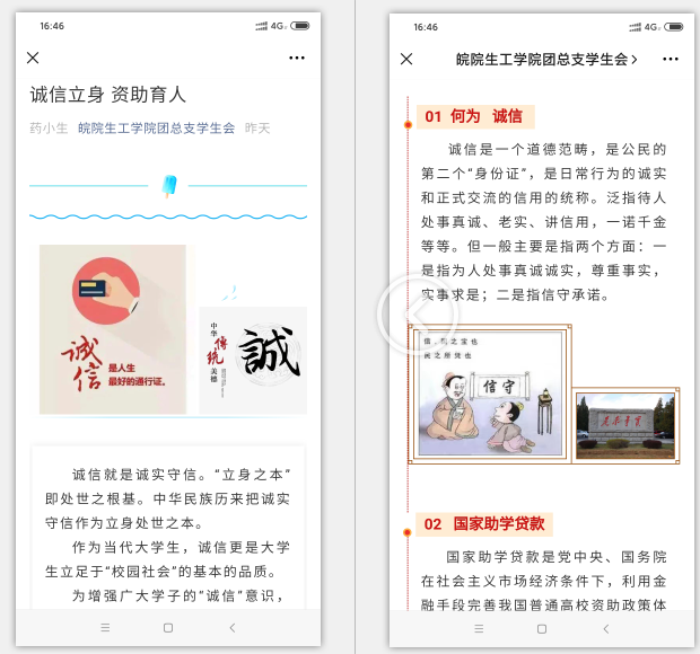 利用新媒体平台进行线上宣传。学院利用团总支微信公众号,广泛宣传诚信的内涵,诚信的重要性及失信的危害,教育引导广大学生讲诚信、恪守诚信,做诚信大学生。
