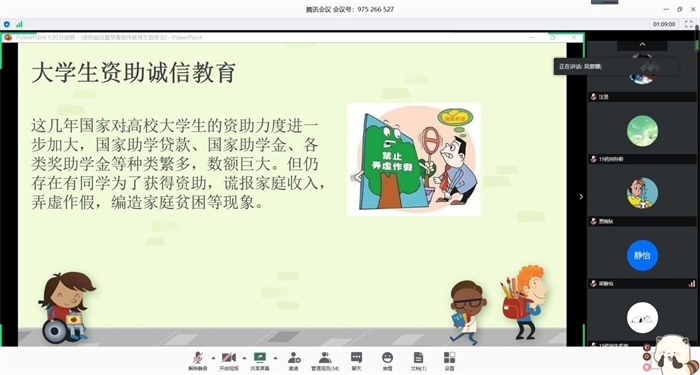 开展资助诚信教育主题班会。由于受到疫情影响,学院各辅导员通过线上形式召开了资助诚信教育主题班会,为大家解读相关资助政策的同时强调诚信的重要性及失信的危害性,教育获得奖助贷的学生要诚信更要懂得感恩,努力学习,回报社会。同时,在班级群发起广泛讨论,大家畅所欲言,谈谈自己对诚信的理解,使大家充分认识到了诚信的重要性。