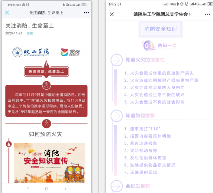 学院团委学生会官方微信公众号和易班平台进行消防法律法规及消防安全知识宣传,让学生了解消防安全的相关知识,进一步认识火灾的巨大危害,增强学生遵守宿舍管理制度的自觉性,不使用违规电器和明火,维护公共安全。