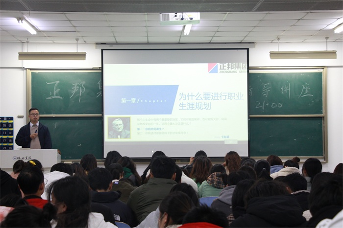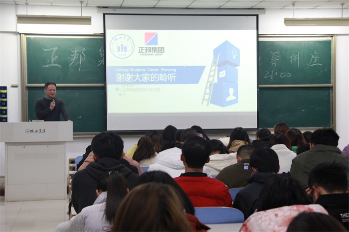 讲座开始,郑红蕾给大家介绍了金宝春经理的基本情况并宣布讲座正式开始。随后,正邦集团苏皖片区总经理金宝春上台演讲,他首先从企业覆盖、企业销售、员工数量、涉及行业及子公司等方面向同学们介绍了正邦集团的企业情况;然后从“为什么要进行职业生涯规划、如何进行职业生涯规划、职业生涯规划的实施步骤”这三个方面为同学们展开了讲解并具体分享了自身的经验,讲述了职业生涯规划的作用和重要性,金宝春指出,将来大家走上工作岗位一定要为了理想目标、提升自我能力而跳槽,不要为了加工资而跳槽,用热爱战胜恐惧。紧接着他介绍了正邦集团人才观、核心价值观、学习观和正邦集团180人才体系建设。最后告诫同学们一定要结合自身确定远、中、近发展目标,制定实施计划与措施,并且向大家简要介绍了皖院学子在正邦集团的关键岗位占比分布。在讲座最后,苏皖地区人力资源部负责人从人力资源管理的角度为同学们提供了意见建议,告诫同学们一定不要怕受委屈,勇敢地去奋斗。