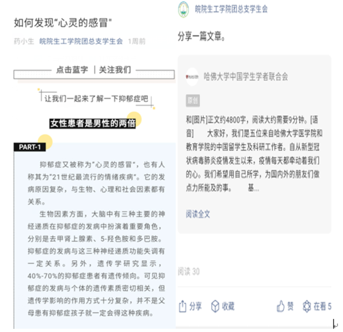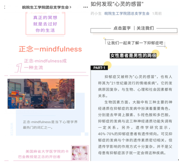 每月在生工学院团委学生会官微和易班平台推送心理健康小知识、短视频等普及心理健康知识,更多学生学会了合理安排时间、友善交往、适当自我疗愈和情绪管理。