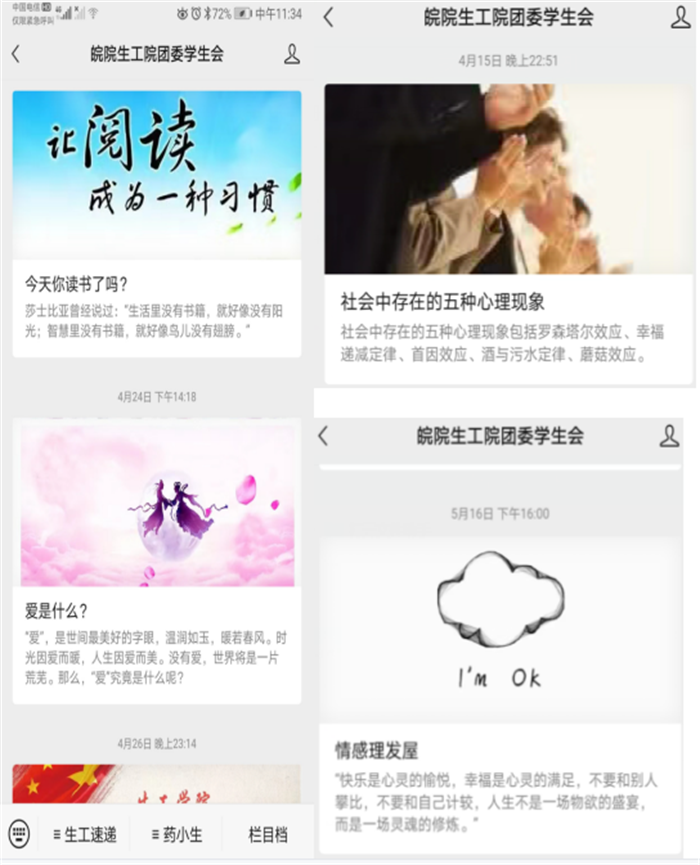 四是学院心理辅导站将一如既往做好心理育人各项工作,使大学生心理健康教育活动常态化,积极利用学院团委学生会微信公众号、生工学院心理委员群等宣传发布相关心理健康小知识、短视频、微电影等,丰富同学们的业余生活,提高同学们的创新创业意识和实践动手能力。