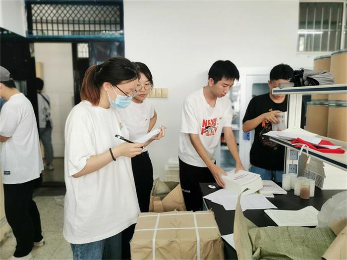 段文昌老师的指挥下,学生第一支部2018级学生党员分成7个组,每个组负责一个专业班级教材的清点、分包、搬运、出库等工作。生工学院2021级新生有动物科学、动物医学、制药工程、药物制剂、生物工程、食品质量与安全和中药学7个专业,涉及的教材种类多,数量大,分发任务极重,但同学们在发书过程发扬不怕苦、不怕累的精神,团结协作,认真仔细,整个发书过程秩序好,效率高,顺利地完成了7个专业8500多册教材的发放任务。