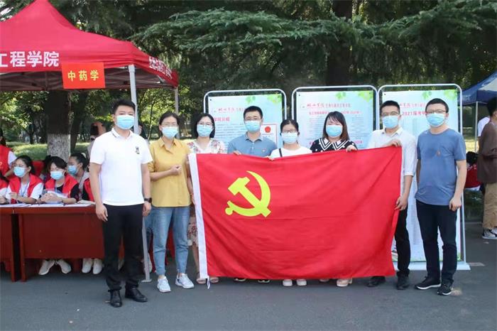 艳阳高照,党员们佩戴党徽,在学校门口的报道展台集合,协助学院进行迎新工作。面对一张张稚嫩又充满朝气的面孔,