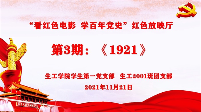 为持续深入学习贯彻习近平总书记七一重要讲话精神和党的十九届六中全会精神,继承弘扬伟大建党精神,推动党史学习教育走实走心,1121日晚生工学院学生第一党支部全体党员和生工2020级同学在A201集体观看了红色电影《1921》,重温了建党之初那段波澜壮阔的光辉历史。此次观影活动也是党建带团建的有益尝试。