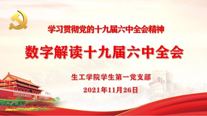 为了深入学习贯彻十九届六中全会精神,2021年11月26日晚,生工学院学生第一党支部在A301召开十九届六中全会精神专题学习会,支部书记段文昌同志为全体党员讲授了题为《数字解读十九届六中全会》的微党课。