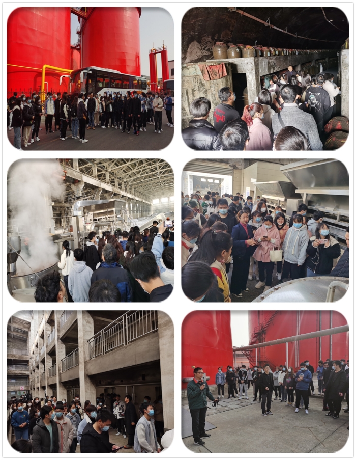安徽迎驾贡酒股份有限公司是中国白酒企业的第一家国家级绿色工厂、全国酿酒骨干企业、中国生态酿酒的倡导者与引领者。公司依托大别山自然保护区内的竹根剐水、以中温包曲为糖化发酵剂、运用多粮型传统工艺和现代科技手段精心酿造,采用“生态产区、生态酿艺、生态循环、生态洞藏和生态消费”的全产业链生态模式,为中国白酒产区建设提供了一个样板。我院优秀毕业生校友、公司质检部孙力主任和生产部贾勇磊主任带领大家先后参观了迎驾酒文化博物馆、黄岩洞生态酒洞藏基地、中温包曲制曲工厂、曲酒发酵车间、灌装生产车间和公司肥料废水生态循环利用处理中心等,并向同学们详细介绍了企业文化和生产经营等基本情况。
