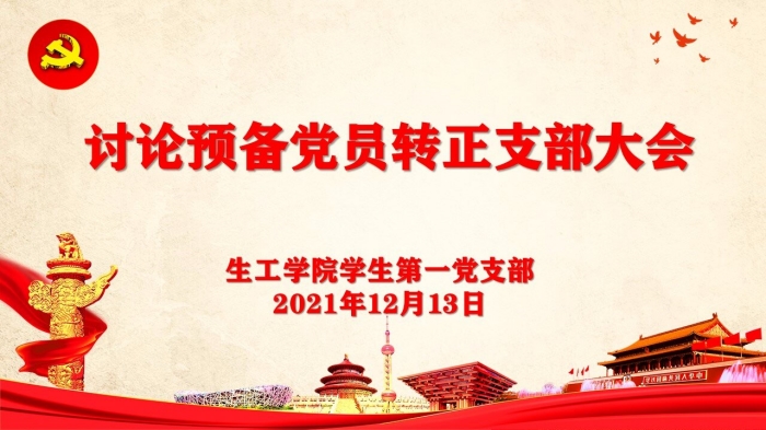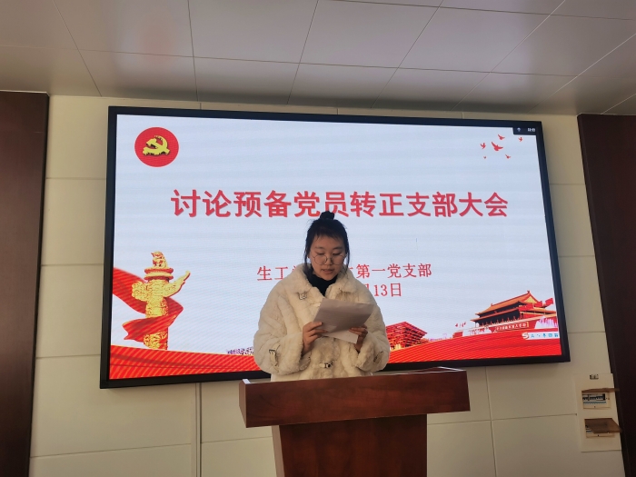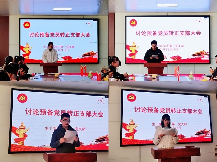 为扎实做好党员发展工作,推进基层党支部组织建设,保持党的先进性和纯洁性,2021年12月13日下午,生工学院学生第一党支部在A301召开2021年下半年预备党员转正大会,讨论刘贤等9位同志的转正问题。会议由支部书记段文昌同志主持,全体党员参会,共同见证这一庄严而神圣的时刻。