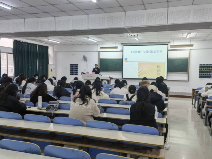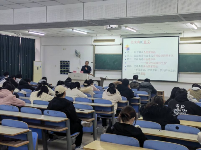 新中国首部以“法典”命名的法律是《民法典》,被誉为“社会生活的百科全书”和“保障民事权利的宣言书”。赵德玖老师围绕《民法典》,以《民法与现代社会生活》为讲座主题,从民法的性质和地位、《民法典》立法目的和制定《民法典》的重大意义、《中华人民共和国民法典》的文本结构、《民法典》中的法律原则到《民法典》对公民权利的保护五大部分,通过理论与案例结合的方式,将大家所熟悉的校园环境、家庭环境等现代生活场景代入,使原本晦涩难懂的法律条文变得生动灵活起来。在讲解的过程中,赵德玖老师告知大家遇事如何运用法律武器维护自身的合法权益,具有很强的针对性和实用性。在讲座的最后,赵德玖老师着重强调,《民法典》是一部以人为本、以权利为纲的法律,处处体现了人文关怀,这正是党和国家尊重社会发展规律与人民历史主体地位的生动体现。整场讲座加深师生们对《民法典》的认知和理解,收到了良好的法治宣传效果。