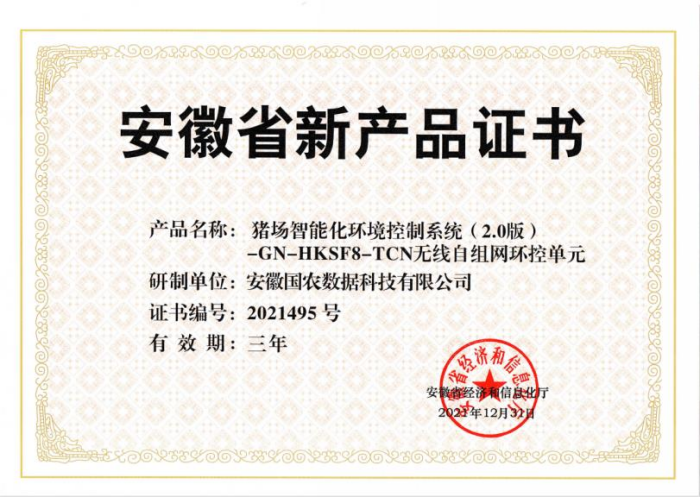 2021年12月31日,安徽省经济和信息化厅组织专家在合肥召开新产品认定会,由BB贝博艾弗森官方网站佘德勇博士所在的畜牧工程团队与产学研合作单位安徽国农数据科技有限公司共同开发的“猪场智能化环控设备—GN-HKSF8无线自组网环控单元”通过专家认定,获得安徽省新产品证书,证书编号2021495号。