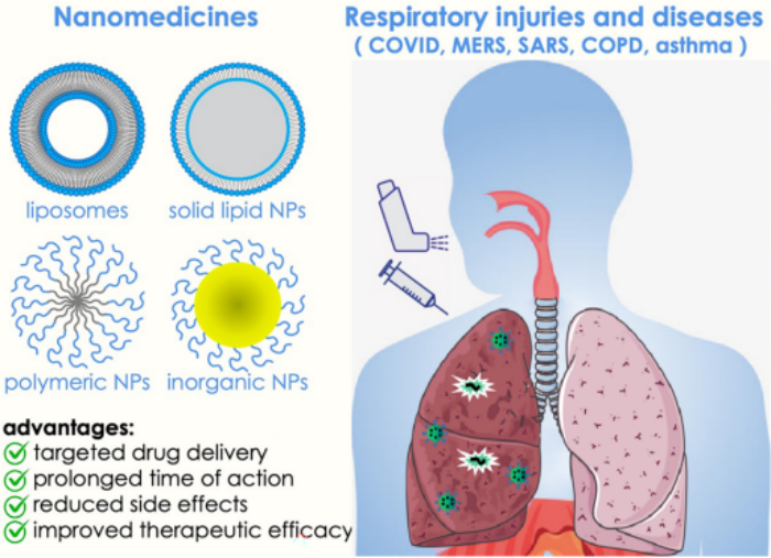 呼吸系统在脊椎动物生物学中占有至关重要的地位。由病毒感染比如COVID-19, MERSSARS等引起的呼吸系统损伤可能导致严重甚至致命的情况。到目前为止,还没有特别有效的治疗呼吸系统损伤的方法,这代表着迫切的临床需求,特别是在当前新冠肺炎大流行期间。纳米药物在治疗呼吸道损伤方面具有很大的潜力。本文就主要呼吸道损伤、急性肺损伤(ALI)和急性呼吸窘迫综合征(ARDS)的病理和临床治疗进行综述。主要介绍了以脂质体、固体脂质纳米粒、聚合物纳米粒和无机纳米粒为基础的纳米药物在临床前模型中通过吸入或者静脉注射给药途径治疗呼吸道损伤疾病。这些纳米药物被用来输送各种治疗剂,包括皮质类固醇、他汀类药物和核酸等。此外,本文还介绍了纳米药物用于其他呼吸系统疾病的治疗情况,包括慢性阻塞性肺疾病(COPD)和哮喘。各种纳米制剂的临床前研究结果令人振奋,表明纳米药物在未来呼吸道病毒感染和疾病的临床治疗中具有不错的潜力。