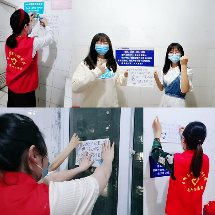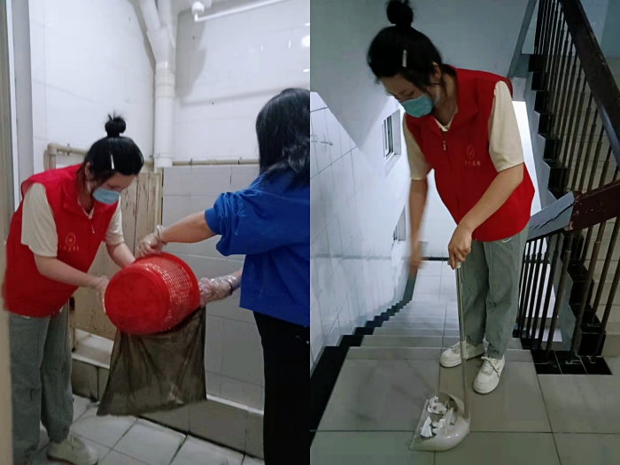 同时由于管控,宿舍楼好几百名同学,每天产生很多垃圾,保洁阿姨无法正常工作,在楼内的党员主动服务大家:通过张贴宣传语呼吁同学们做到非必要不出宿舍,出宿舍必戴口罩;保持宿舍勤通风将厕所的垃圾桶套袋维护水池、打水机、洗衣机,走廊和楼梯等公共场所的环境卫生;主动更换垃圾袋,及时清理垃圾,带头做好卫生防疫工作。