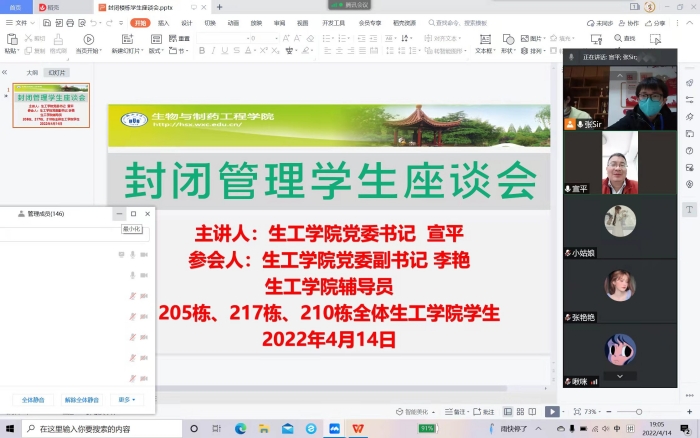 为合力打赢疫情防控校园阻击战,更加全面了解受疫情影响而封闭楼栋的学生心理状态和面临的困难,生工学院于2022年4月14日晚召开封闭管理学生线上座谈会,生工学院党委书记宣平,生工学院党委副书记李艳,学院辅导员和封闭管理全体学生参加此次会议。
