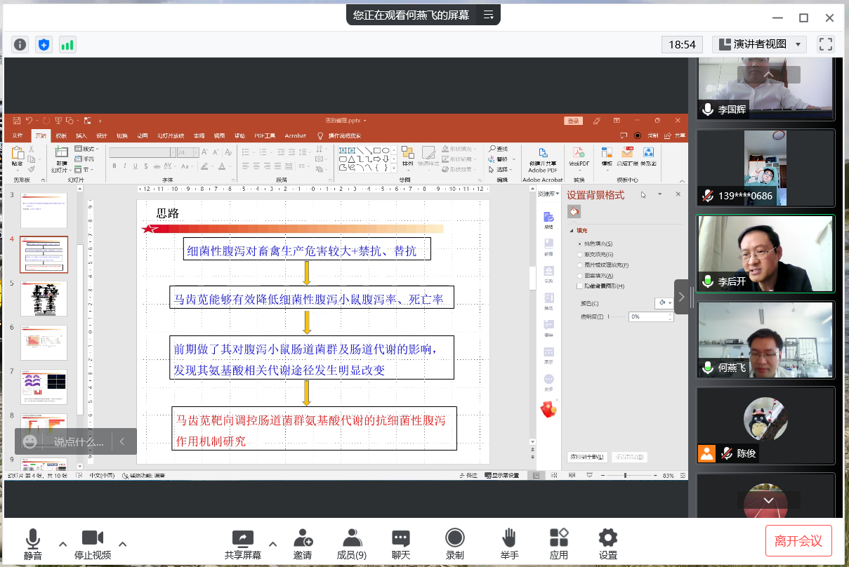 交流会中,何燕飞、李国辉、李芳等三位青年博士分别就各自的研究基础、国自然项目的研究目标、拟解决的科学问题以及下一步工作安排等进行了交流分享。三位老师在认真听取汇报的同时,分别结合各自的科研经历作了细致的评价指导,给出具体修改建议,甚至需要重新遴选研究方向。通过这种点对点的交流分享,博士们对各自研究方向的遴选、研究目标的设定、技术路线的设计等有了新的认识、对后期科研工作也有了新的设想。在近3个小时的分享交流中,老师们严密的科学思维、严谨的工作态度,让青年博士们再次深受教育。