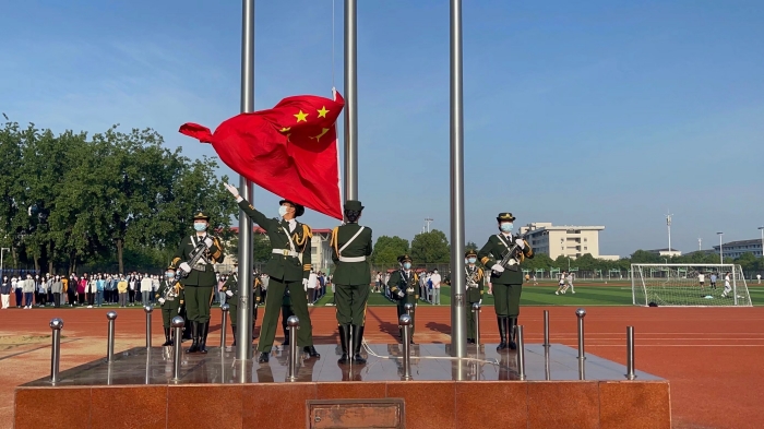 恰逢阳光正好,正当微风不燥,我们相逢在最美的时刻,我们重逢在最恰当的岁月。红旗飘扬,升起的是信仰;脚步铿锵,肩负着使命和担当。清晨7时整,升旗仪式正式开始,国旗护卫队成员英姿飒爽、昂首阔步踏着整齐划一、铿锵有力的步伐走向升旗台,全体成员面向国旗庄重肃立,行注目礼。伴随着雄壮激昂的《义勇军进行曲》,鲜艳的五星红旗冉冉升起,迎风飘扬,在晨光中熠熠生辉。