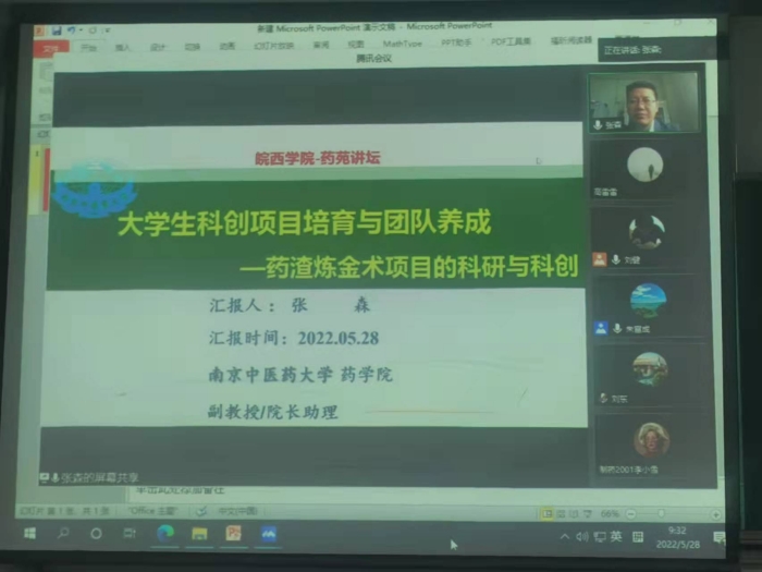2022528日上午,BB贝博艾弗森官方网站在C205举办了 “药苑讲坛”系列学术报告第七期线上学术交流讲座。南京中医药大学药学院刘健副教授和张森副教授应邀分别以《小分子创新药物设计与合成》和《药渣炼金术项目的科研和科创》为主题进行报告。会议由人事处副处长朱富成博士主持,学院部分老师及相关专业学生参加了报告会。