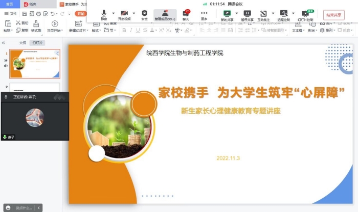 为进一步落实落细《中共安徽省委教育工委安徽省教育厅关于深化家校共育促进学生心理健康教育工作的通知》精神,充分发挥家庭力量在学生心理健康成长中的积极作用,生工学院“药”你阳光心理辅导站积极搭建家校沟通平台,组建家长讲师团,汇聚家校育人合力,于11月3日晚通过腾讯会议开展首次家长讲师团心理健康教育交流活动。本次活动由2022级辅导员周海霞主持,2022级生工、食安、制药、药剂和中药学5个专业共102位家长参加。