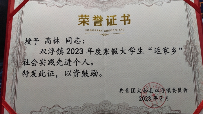 高林同学积极响应政府号召,投身到为人民服务的事业中,认真帮忙处理群众入党方面的问题,帮助党支部书记整理述职报告与民主生活会的文档。他陪同干部下乡进行宣传禁燃禁放等工作,在实习期间前往各社区为群众进行反诈宣传,增强了群众防诈骗意识。高林同学的志愿服务得到了共青团太和县双浮镇委员会的好评。