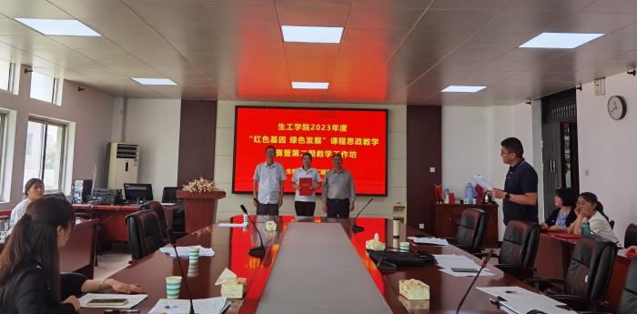 为扎实推进学习贯彻习近平新时代中国特色社会主义思想主题教育,促进教育教学高质量发展,进一步推进课程思政建设,提高教师教育教学能力,6月7日上午,生工学院在A楼301组织开展“红色基因,绿色发展”为主题的教学工作坊活动——生工学院首届课程思政教学竞赛。生工学院党委书记宣平、教务处副处长蔡俊岭参与本次活动,生工学院副院长刘东进行主持。