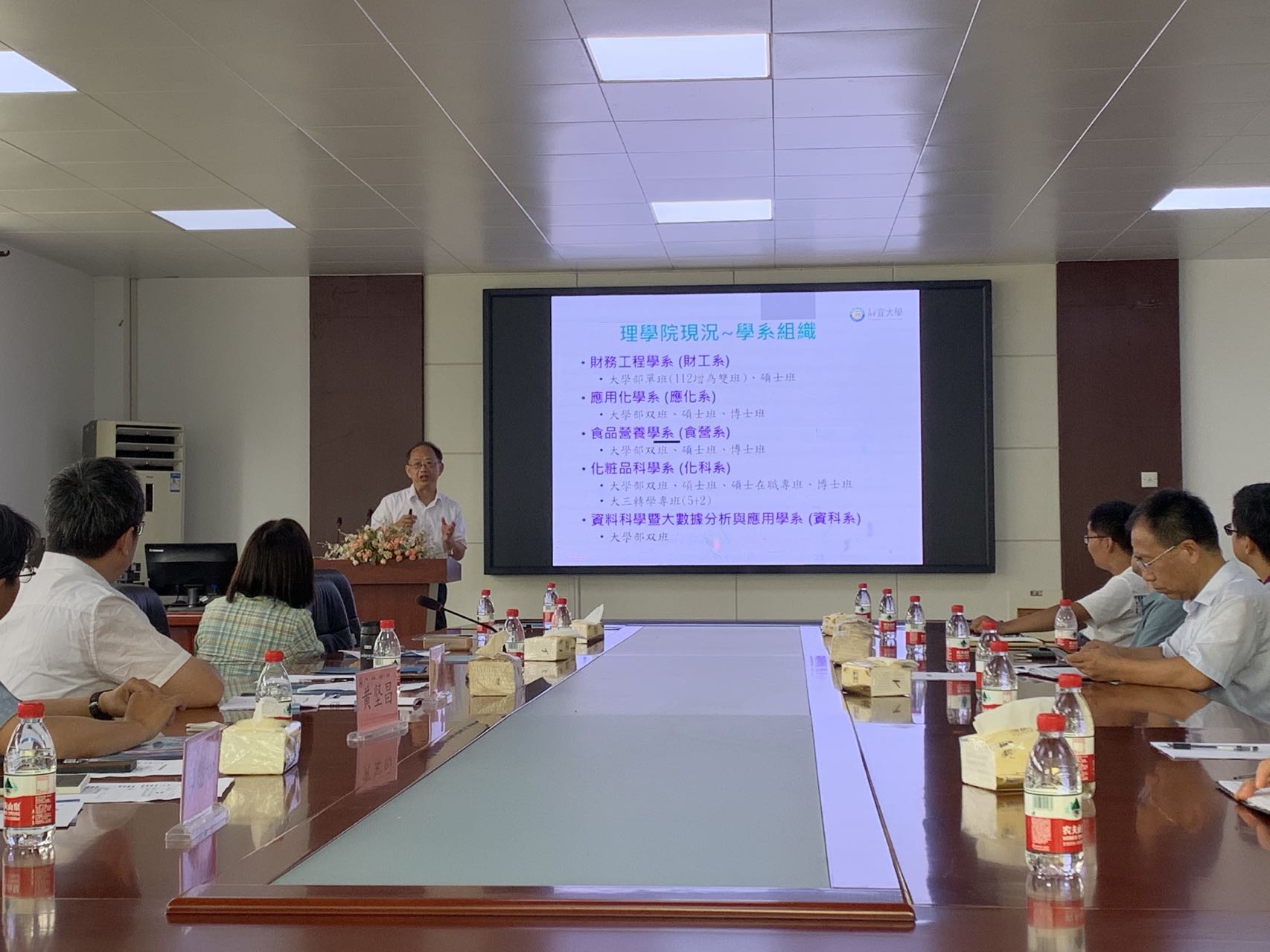 在7月14日“皖台中药资源开发利用科研交流”活动中,陈俊宏、黄坚昌、詹社红分别报告了各自的研究领域和方向,尤其是络氨酸激酶在化妆品开发技术领域的应用,与参会的青年博士进行深入交流,为双方在大别山特色资源植物的高值化开发利用等方面的后续合作奠定了基础。负责教学计划安排的白惠如老师,详细介绍了静宜大学本科学生的课堂教学方法、教学效果评价等,为双方本科学生课堂教学设计与互派学习交流提供了参考。经过近四个小时的交流研讨,双方在“持续交流与合作、开展特色资源植物的化妆品开发利用技术研究、开展本科生互派交流培养、建立青年教师互访交流”等四方面达成共识并签约备忘。