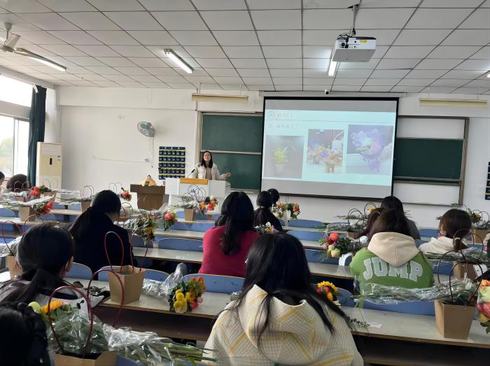 学院邀请了环旅学院胡娟娟老师现场为大家讲解插花艺术相关知识。花艺老师首先为大家详细讲解了插花艺术的由来、鲜花的品种和寓意,再从花材选取、枝叶绑剪、色彩搭配等插花技巧进行讲授,并同步演示插花工具的使用和插花步骤。
