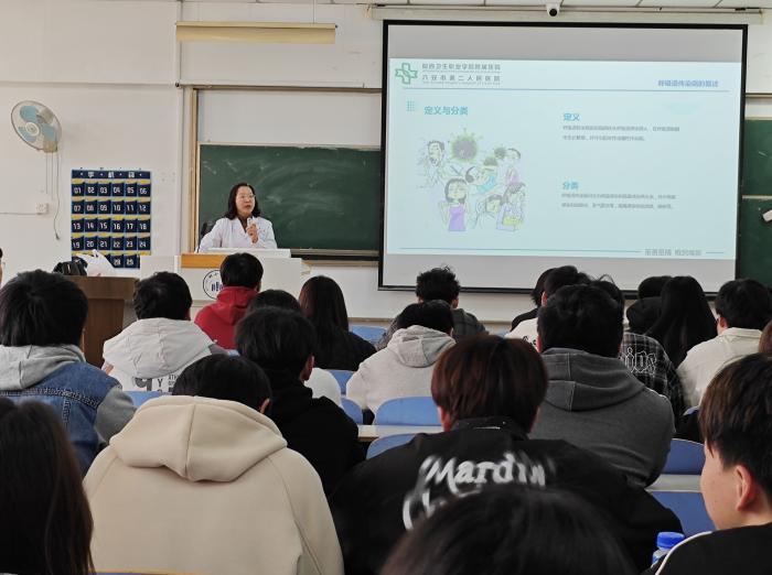 方萍为同学们讲述了呼吸道传染病防控的基础知识,介绍了呼吸道传染病的定义、分类和传播途径,针对近期易发的流行性感冒、肺炎支原体、手足口病、新型冠状病毒、肺结核等传染性疾病从感染源、感染途径、易感人群进行了详细分析。在预防呼吸道传染病措施板块,方萍带来了常用的普通医用口罩、医用外科口罩和N95医用防护口罩,介绍它们的防护等级和使用场景,并现场指导学生如何正确的佩戴口罩。在如何正确洗手的实践展示上,方萍播放了专业医护人员洗手科普宣传片,向同学们介绍了科学的洗手步骤,向在场的同学们很好的宣传了预防呼吸道传染病知识。