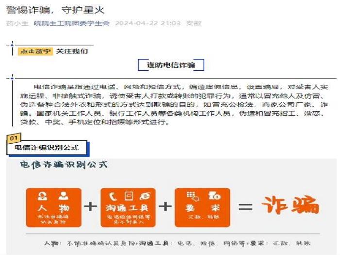 制作防诈推文,深入学生宿舍普及防诈知识。生工学院团委学生会通过官Q、微信公众号发布《警惕诈骗,守护星火》防范电信诈骗推文图文并茂的宣传防范电信诈骗知识。辅导员及班主任们在走访学生宿舍了解学生的思想动态,持续开展涉“两卡”犯罪警示教育宣传,走访过程中针对部分同学特别是新生涉世未深、容易上当受骗的情况,加大了识别诈骗分子诈骗手段教育及提高风险防范意识教育,提醒同学们做到“时时讲安全,处处有警觉”,共同巩固春学期开学以来学院开展的反诈宣传新成果。