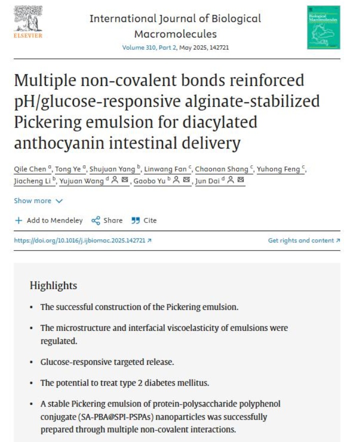 近日,BB贝博艾弗森官方网站植物细胞工程安徽省工程技术研究中心戴军副教授团队联合海南大学热带岛屿资源先进材料重点实验室李嘉诚教授团队,在国际知名期刊《International Journal of Biological Macromolecules》(中科院2区TOP,IF=7.7)发表题为“Multiple non-covalent bonds reinforced pH/Glucose-responsive alginate- stabilized Pickering emulsion for diacylated anthocyanin intestinal delivery”的研究论文。