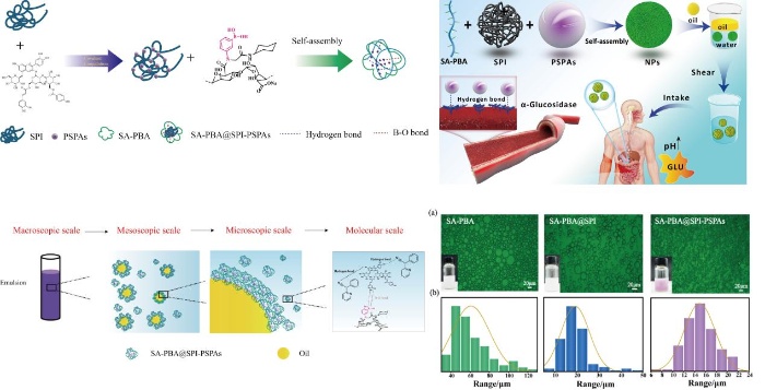 针对上述问题,研究团队开展深入探索,以葡萄糖响应性苯硼酸基海藻酸钠衍生物(SA-PBA)为核心,创新性地提出通过多重非共价键协同作用,构建 SA-PBA 与 PSPAs 修饰的大豆分离蛋白(SPI-PSPA)稳定的 Pickering 乳液。在这一分子组装过程中,氢键与硼 - 氧配位作用发挥主导驱动作用,通过强化分子间相互作用,显著提升了乳液界面膜的稳定性。更为重要的是,该体系成功赋予 PSPAs 葡萄糖响应性,实现了在肠道环境中的靶向释放,从而有效提升了其生物利用度。