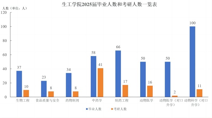 佳绩频传,彰显育人成效。生工学院2025年各专业考研录取率分别为:依托安徽省一流学科和安徽省高峰学科中药学专业作为建设的中药学专业,其考研录取率高达70.69%,继续创造考研升学新佳话,食品质量与安全专业为34.78%,动物医学第一届普高招生毕业班级考研录取率为32%,生物工程专业为27.03%,制药工程专业为25.76%,药物制剂专业为23.53%,动物科学(对口招生)专业为11%,动物医学(对口招生)专业为4%。其中,中药学专业考研录取率与2024届相比较增长了28.09%,食品质量与安全专业考研录取率与2024届相比较增长了21.27%,展现了生工学子扎实的专业功底与不懈的奋斗精神。