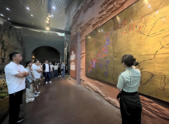 渡江战役纪念馆展厅内,“胜利之师”艺术群雕全景式地展示了解放军乘胜向全国进军的壮阔场面。全体党员佩戴党员徽章,面对鲜红的党旗,举起右拳,庄严宣誓,重温入党誓词,表达了全体党员坚定理想信念、永葆政治本色的决心。在讲解员生动详细的解说下,大家先后参观了战前形势、战役准备、突破江防、战役胜利、人民支前、英烈业绩六大展厅,通过一件件珍贵文物、一幅幅历史照片、一段段纪实影像,感受百万雄师过大江的壮阔场面,缅怀渡江战役的光荣历史。全体党员深刻感悟人民解放军不怕牺牲的英雄气概,深切体会军民同心的鱼水情深,深刻接受一次爱国主义和革命传统教育。