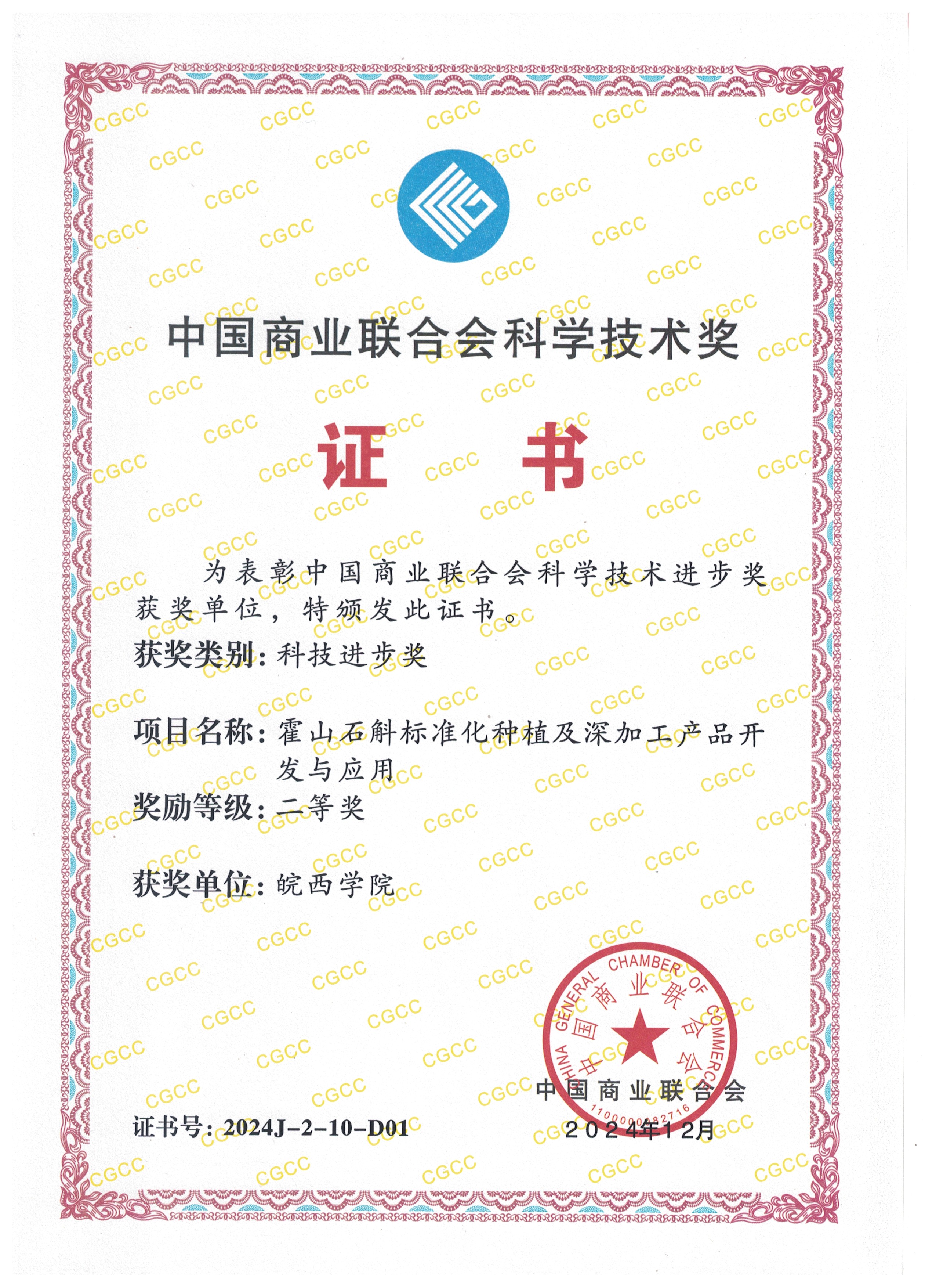 邓辉博士牵头申报的“霍山石斛标准化种植及深加工产品开发与应用”项目由BB贝博艾弗森官方网站、霍山县天下泽雨生物科技发展有限公司、安徽皖西生物科技有限公司、霍山县长冲中药材开发有限公司等单位共同完成。项目在在国家实施标准与标准化建设的背景下,在中药材资源调查与种质创新、大规模种苗繁育、林药复合经营模式、中药材健康产品开发方面进行了系统的探索和研究实践,产生了巨大的经济价值和社会效益,对有效促进霍山石斛产业的高质量发展起到良好的示范和推广作用。