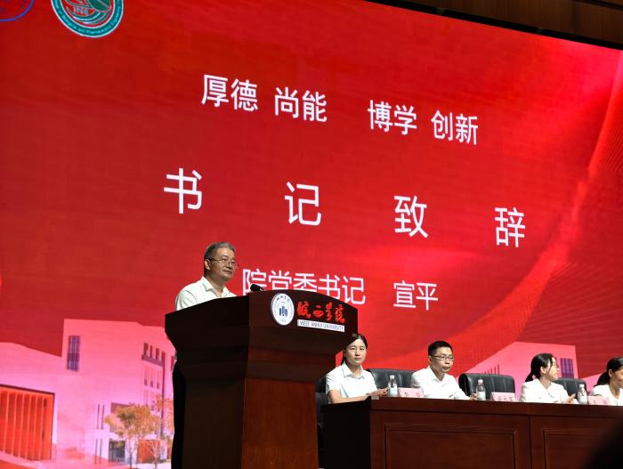 宣平代表全院师生向771名本科生和32名硕士研究生新同学表示热烈欢迎,并以"厚德尚能,博学创新,争做逐梦青春的生工人"为题致辞,寄语新生要在厚德中铸牢做人的精神根基、在尚能中追寻学识的垂直攀登、在博学中实现生命的横向延展、在创新中追求人格的纵向突破,希冀大家要厚植家国情怀、涵养进取品格,以奋斗姿态激扬青春,不负时代,不负华年。