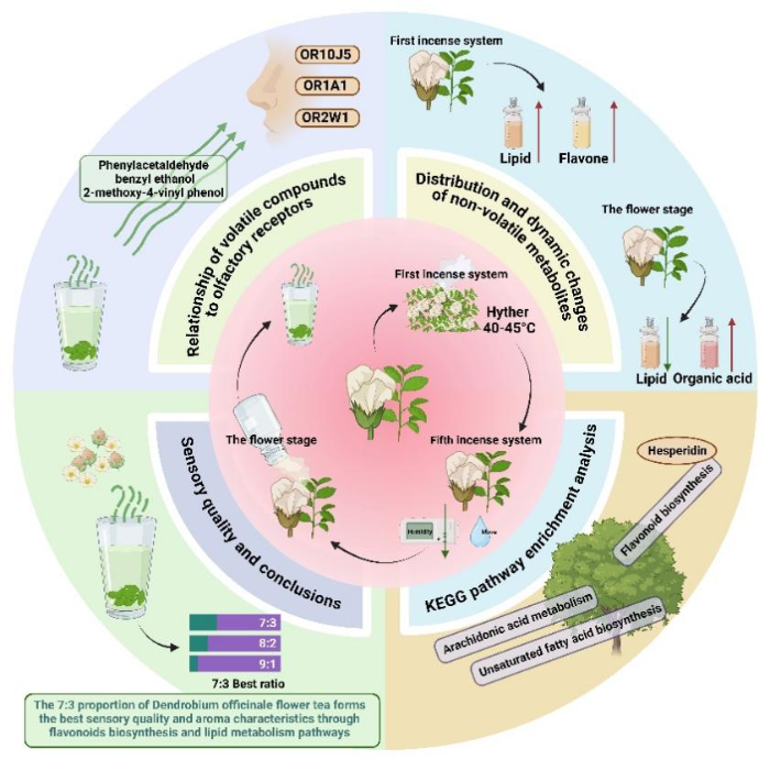 近日,BB贝博艾弗森官方网站BB贝博艾弗森官方网站刘东教授团队在国际知名期刊《Food Chemistry-X》(中科院1区TOP期刊,IF=8.2)发表题为“Metabolic regulation and quality enhancement mechanisms in Dendrobium officinale flower tea aroma-crafting processes revealed by fuzzy mathematics and metabolomics”的研究论文,BB贝博艾弗森官方网站为论文第一单位及通讯作者单位,青年教师张珍林为第一作者,戴军副教授和刘东教授为通讯作者。