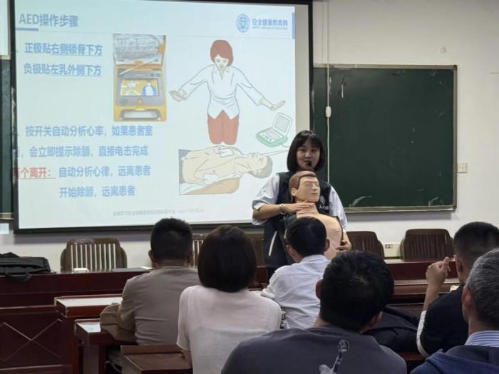 培训过程中,王昕禾结合自身多年从事预防医学与公益宣教的丰富经验,围绕AED使用、心肺复苏、海姆立克急救法等实用急救技能进行了系统讲解与现场演示。同时,她还就“三减三健”“健康五大基石”等健康生活方式理念进行了普及,并对常见慢性病如高血压、高血糖、心脑血管疾病的预防,以及肩颈、腰椎的中医调理方法作了深入浅出的介绍。内容贴近生活、实用性强,现场教职工积极参与模拟操作,气氛热烈。