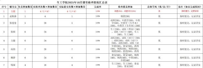 课堂监管:夯实教学过程管理为确保学风建设成效落地,学院组织实施“辅导员课堂巡查”制度。要求全体辅导员“每周查课、每月汇总”深入各教学楼、各班级课堂开展随机查课,建立课堂台账。查课内容涵盖学生出勤、课堂专注度、手机使用、前排入座率情况等多个维度。通过“无死角、常态化”的监督检查,切实营造了“课堂有纪律、学习有氛围”的教学环境,推动学生从“要我学”向“我要学”转变。