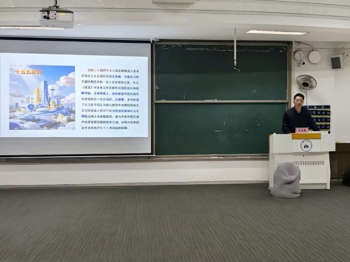 随后,陈道明老师围绕“高质量发展的任务书 中国式现代化施工图—党的二十四届四中全会精神与《十五五规划建设》解读”为主题开展专题培训。他从四中全会的基本概况、十四五取得的重大成就、十五五规划主要目标、十五五规划任务举措、学习贯彻是政治任务等五个方面深入浅出的给青年学子们带来一节生动的思政教育课,并嘱咐青年学子们一定要抱有“功成不必在我,功成必定有我”的态度,以青年挺膺担当助力中国式现代化与安徽的高质量发展。